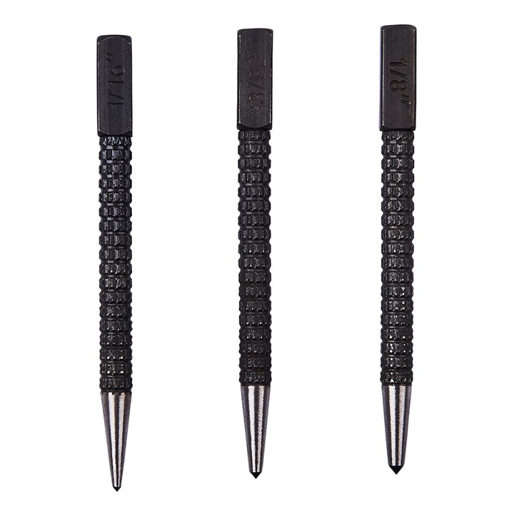 Made from selected alloy steel. Knurled body with square striking head. Set includes sizes: 1/16″, 3/32″, 1/8″. Approx length: 4″ (100mm).