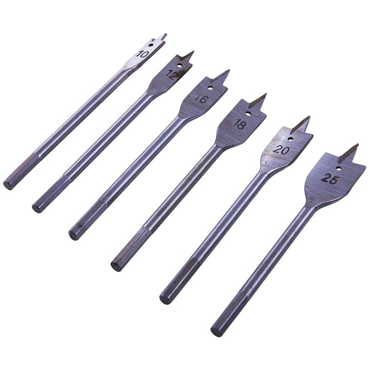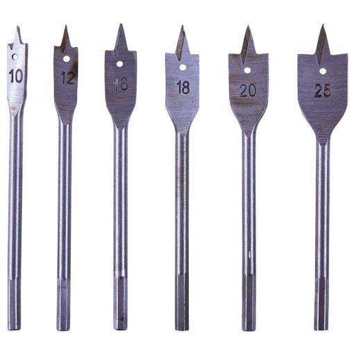 Set includes sizes: 10, 12, 16, 18, 20 and 25mm. Hex shaped stem. Precision ground on all surfaces. For cutting straight or angled holes in hard or soft wood.
