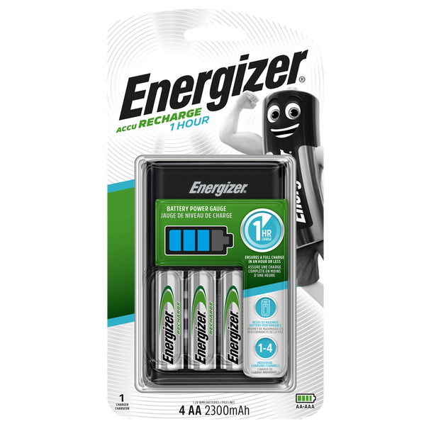 The sleek¬†1 Hour Battery Charger from Energizer¬†is a fast charger for AA rechargeable batteries. It has green LED charge lights that inform the user if the batteries are properly charging or not. It has built-in voltage and temperature monitoring functions, plus its short charging time makes this battery a smart choice for people who quickly need battery power. As well as an AC wall adaptor plug, this Energizer charger also features a 12V DC port which can be used to power the charger from a car if the correct lead is used (Car adapter not included) – a convenient feature for people who are always on the go. Passing the stringent energy efficiency standards of the industry, the Energizer 1 Hr battery charger bears the seal of excellence of Energy Star.
